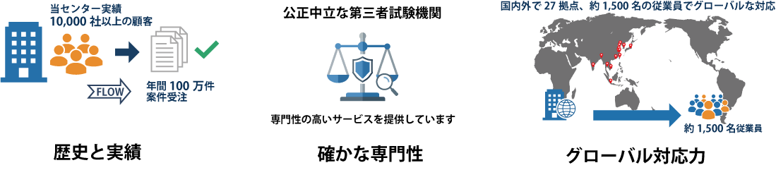 メーカーや販売店に偏らない公平・中立な「第三者機関」として、常に誠実な評価を提供しており、国内外で27拠点、約1500名のネットワークを駆使し、世界各国の安全基準や規制に迅速に対応します。