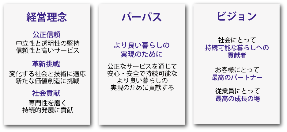 私たちは、第三者機関としての「公正信頼」を堅持し、安心・安全で持続可能な社会の実現に貢献します。