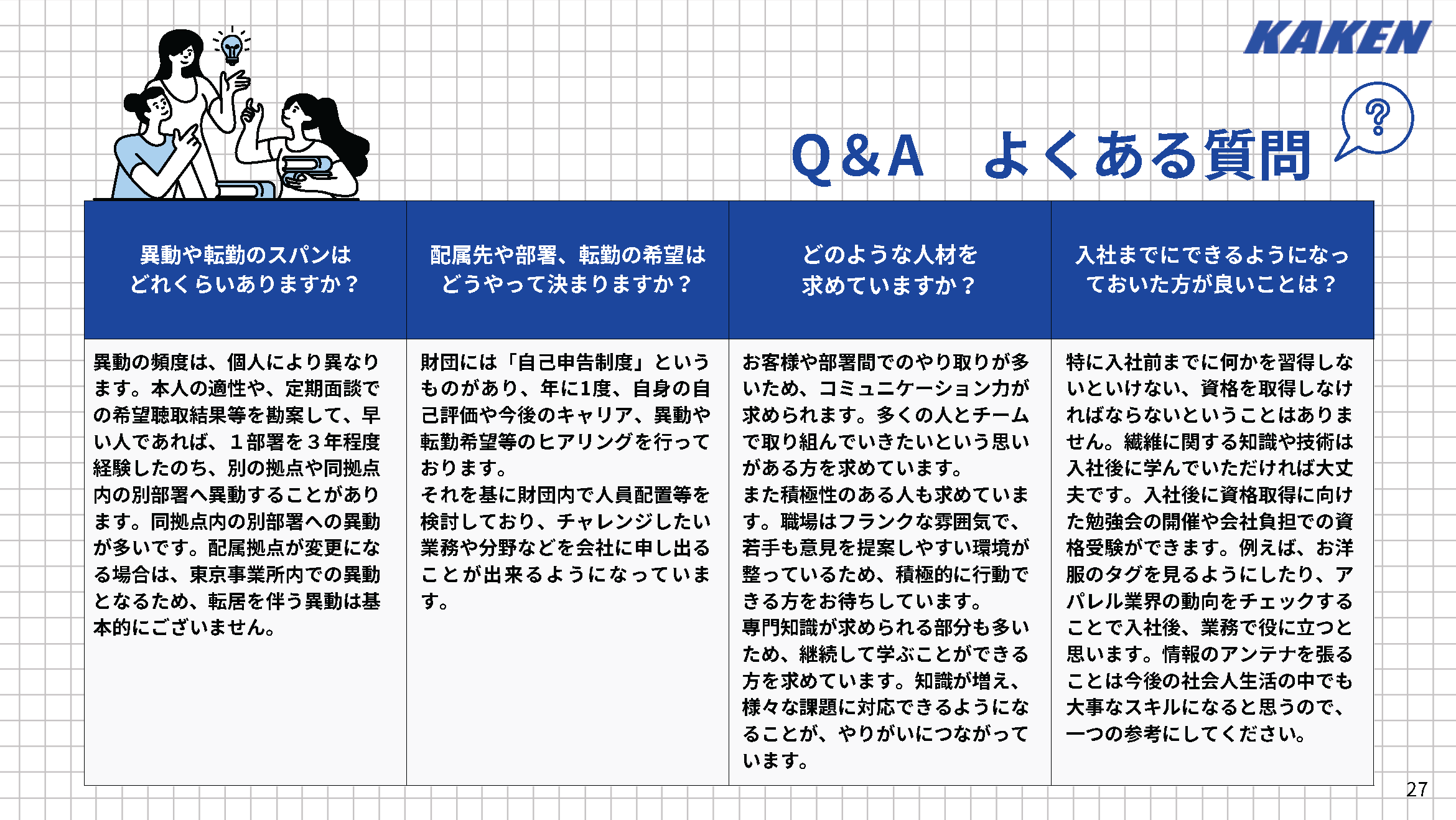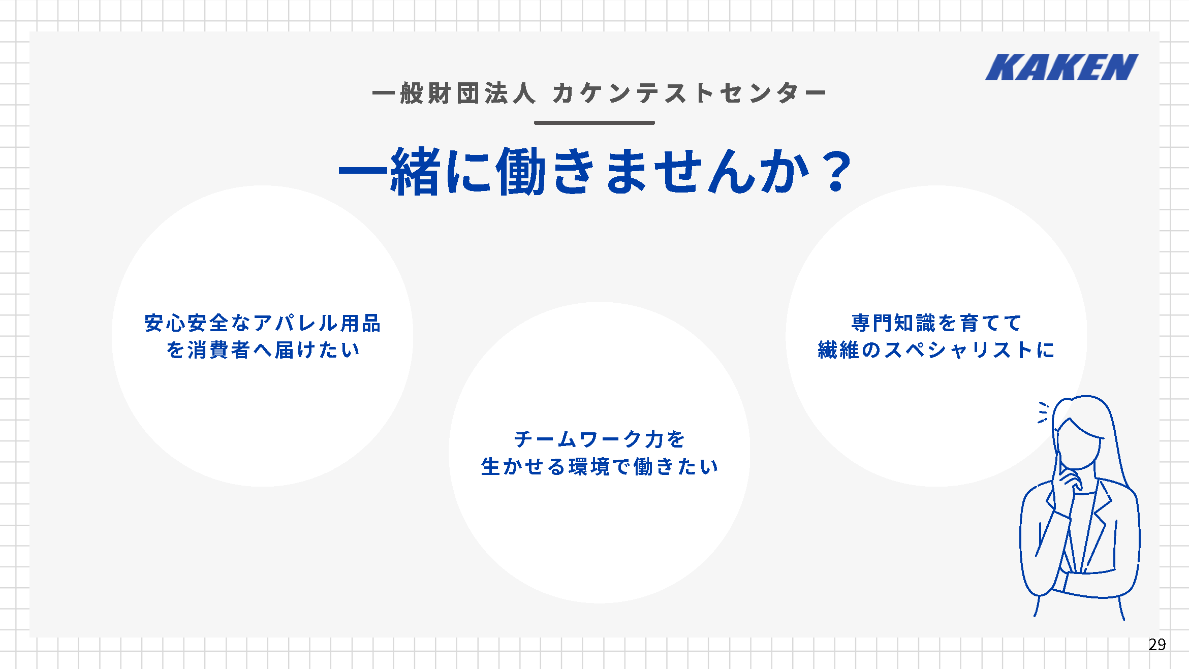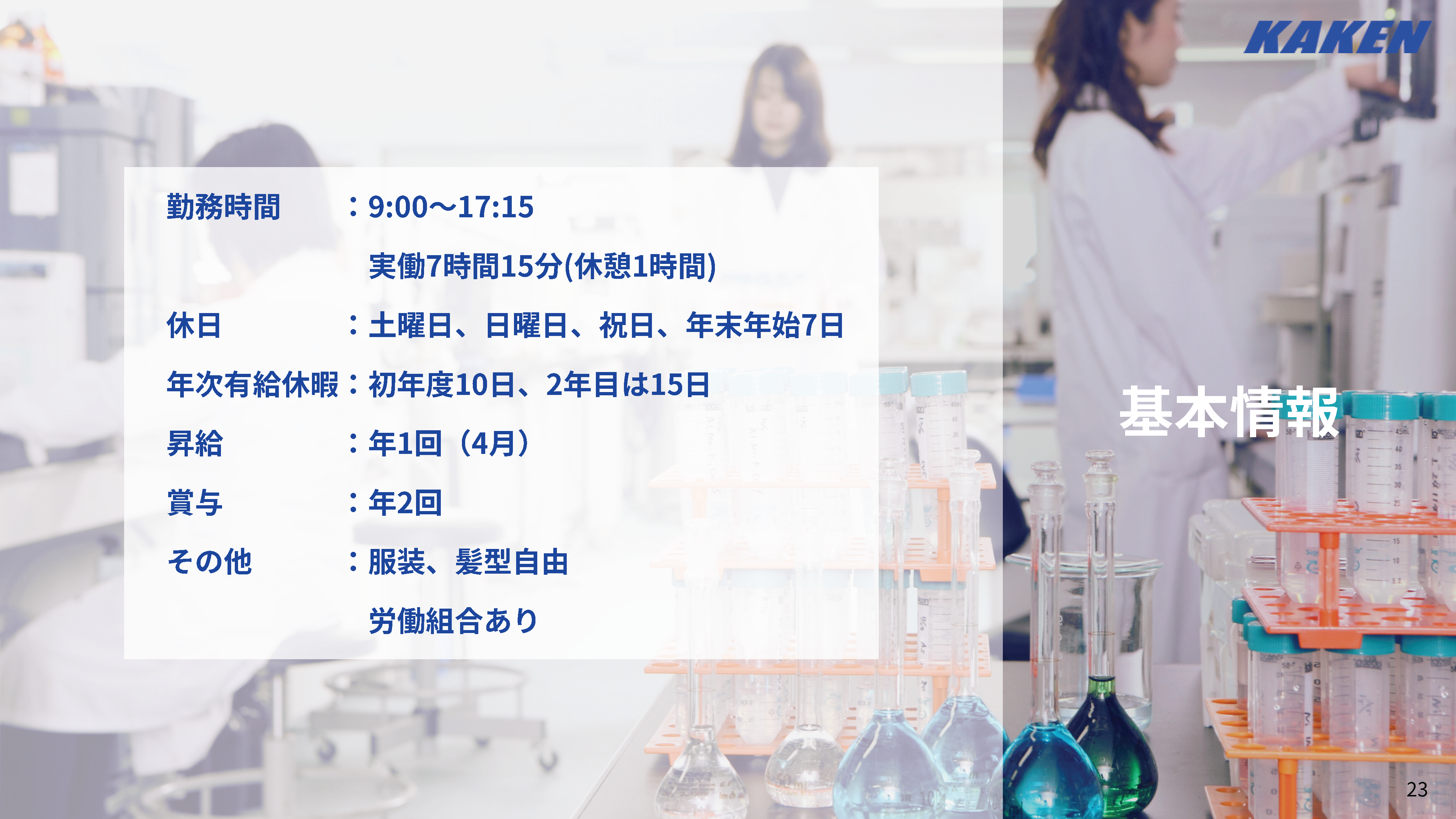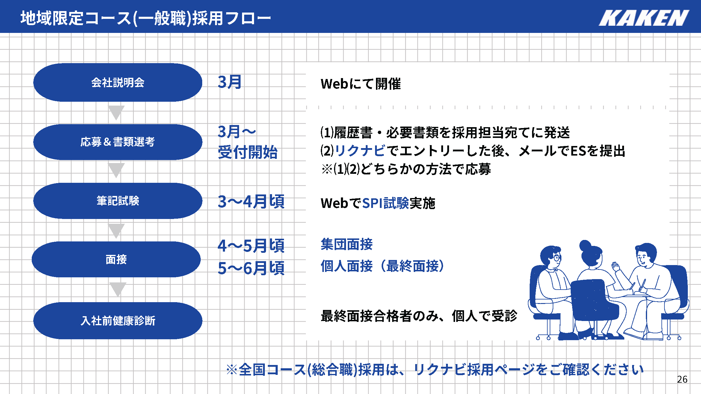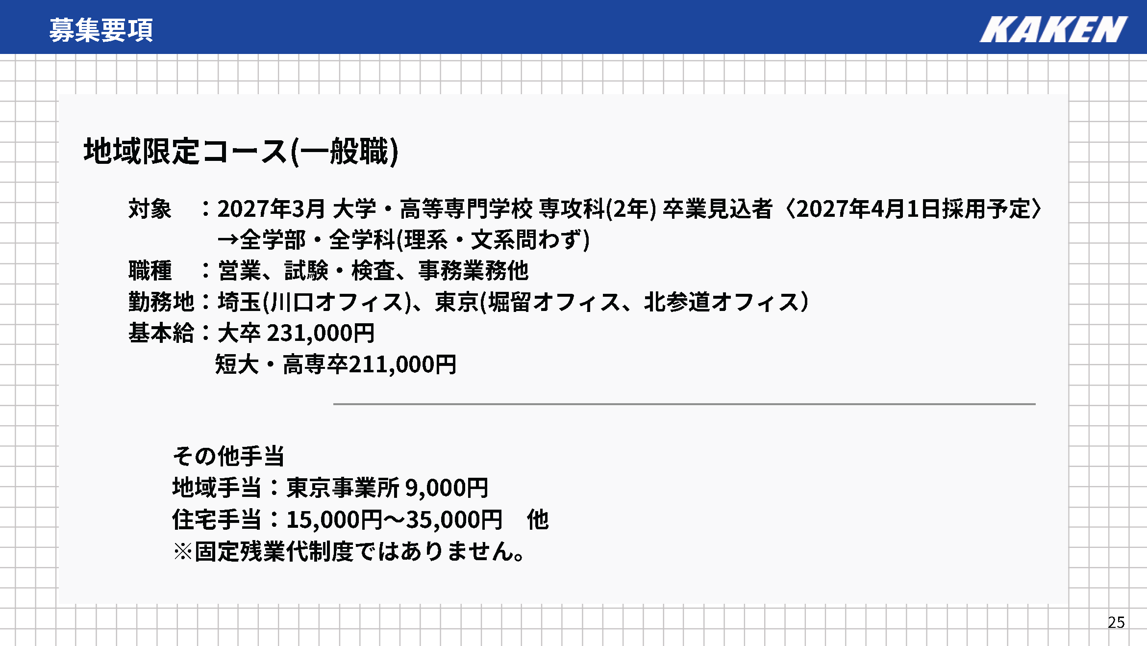 一般職については、各事業所・検査所ごとに採用を実施しております。カケンの事業所・検査所については、採用時期や採用情報などがあれば、以下にご案内いたします。皆様からのエントリーを心よりお待ちしております!