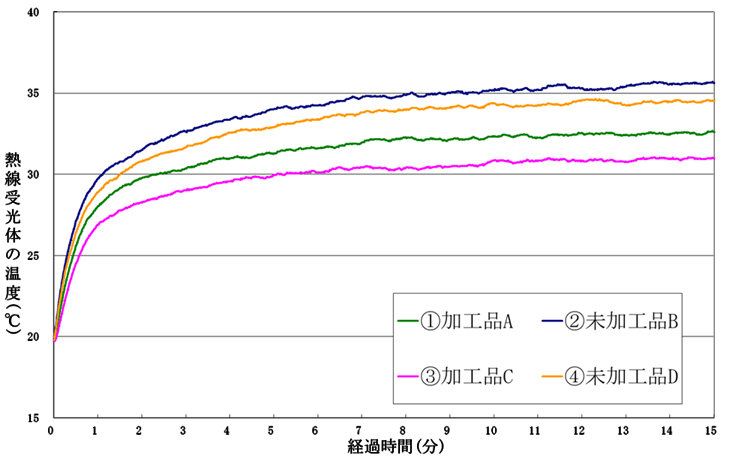 試料背面に熱線受光体を非接触で配置し、試料を透過した日射の熱(放射熱)を熱線受光体に吸収させます。光を照射して30分後の試料を装着した熱線受光体と、裸の熱線受光体(ブランク)の上昇温度をそれぞれ測定し、遮熱率と区分記号を求めます。