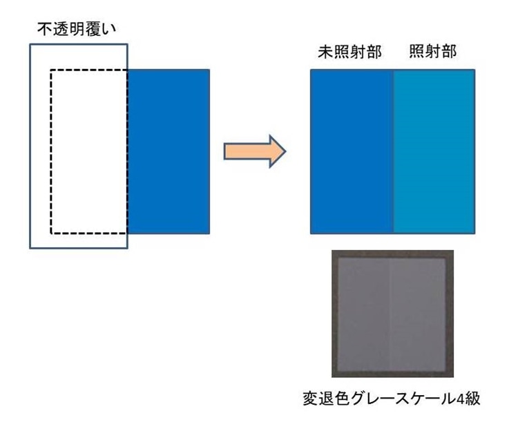 第3露光法では、試験片とブルースケールの面積の半分を不透明覆いで覆い、光を照射します。時々ブルースケールの覆いを開き標準退色しているかを確認します。標準退色とは、光をあてた照射部分と未照射部分の色の差が、変退色用グレースケールの4号に相当する状態です。ブルースケールは1級から8級まであり、数値が大きいほど光に対する抵抗性が強く、標準退色するのに必要な時間が長くなります。使用頻度の高いのは3級と4級のブルースケールです。