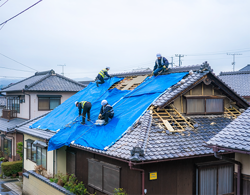 「屋根用応急シート」とは、台風や地震等の被災時に 屋根の修理を行うまでの応急処置を目的として使用される「ブルーシート」と呼ばれるものを指します。